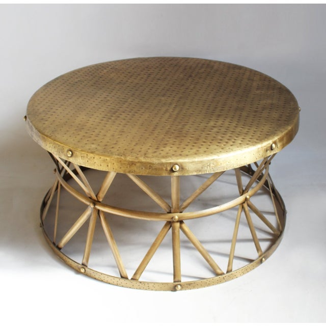 Convenient yet distinctive, this drum adds a gentle gleam and versatile function to any home or office. In a hammered finish, this coffee table has an elegant rounded shape with beautiful texture, along with shiny and matte finishes to. Brass finish round textured metal coffee table with hand hammered iron legs. This is a great side table for any space. More details coffee table with carved starburst radial motif on top and then clad in an antique brass sheet.